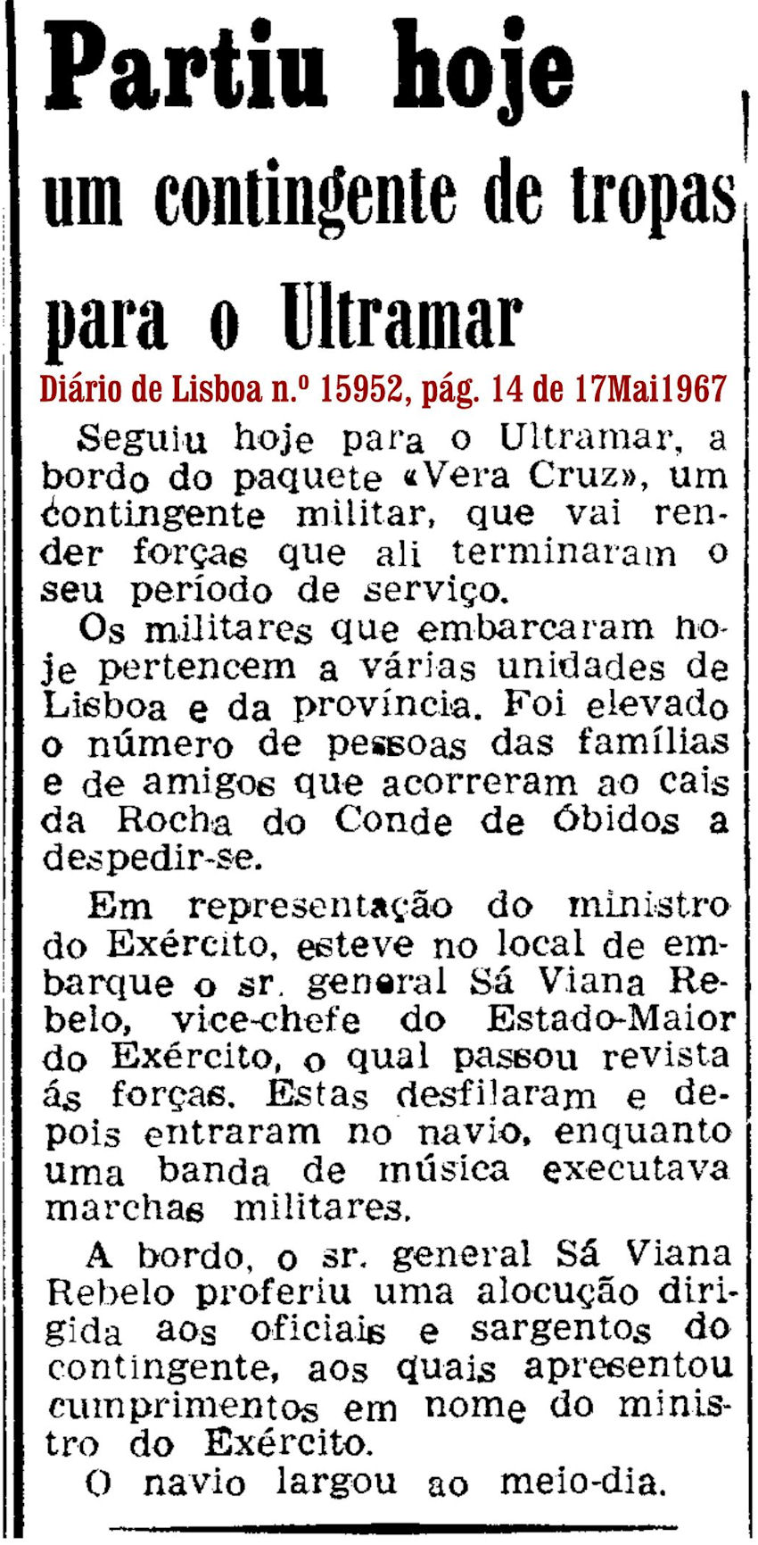 embarcou no dia 17 de Maio de 1967 no NTT "Vera Cruz", integrado na