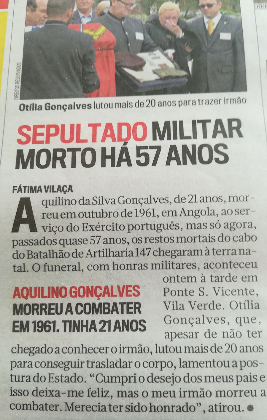 «Sepultado militar morto há 57 anos»