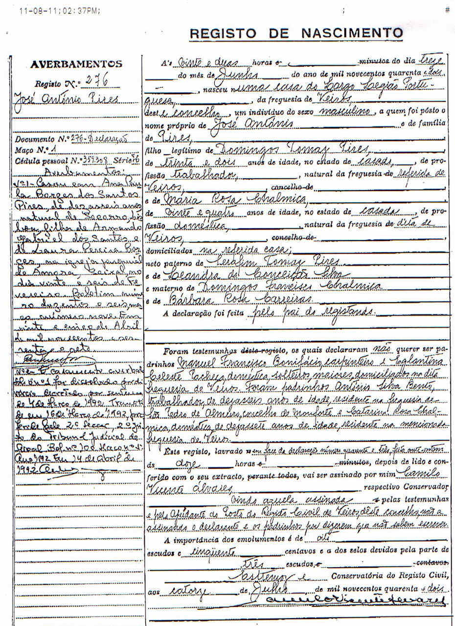 de nascimento do seu pai - José António